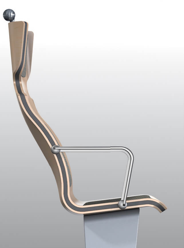 As a follow-up to the study into more sustainable public transport equipment we developed a concept for a sustainable train seat, the AtoB seat. Where comparable train furniture consists of more than 150 parts per seat, we wanted to create one with just 10 parts. This would directly reduce the number of materials used, with all the benefits for recycling and reuse. The chair-design is based on a comfortable one-piece seat shell, pressed from wood.